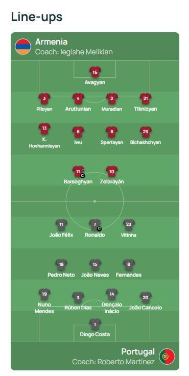 直播吧09月06日讯 世预赛欧洲区小组赛F组,亚美尼亚vs葡萄牙,赛前双方首发公布!由于此前参加欧国联,本场比赛是葡萄牙本届世预赛的第一场比赛。